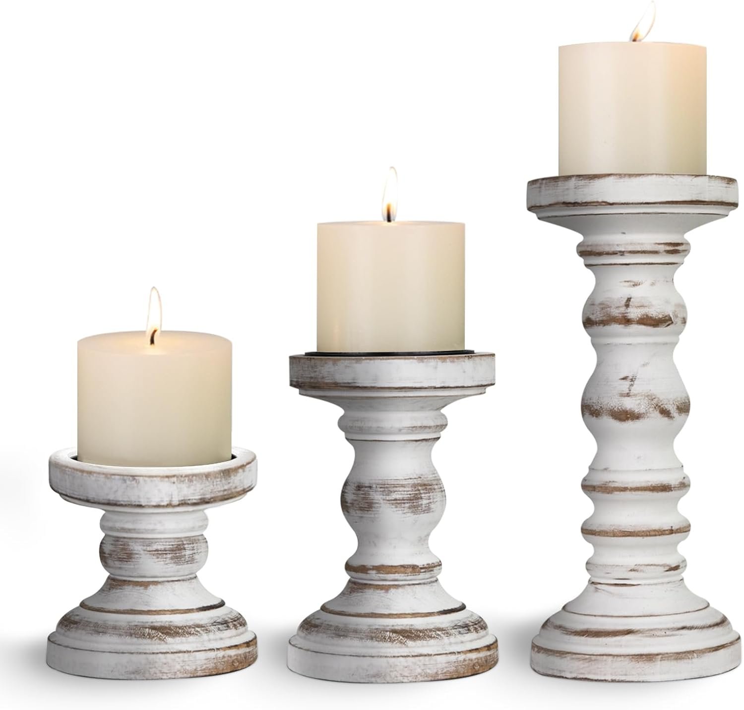 Handcrafted wood holders for pillar candles adds warmth to rustic-themed reception tables