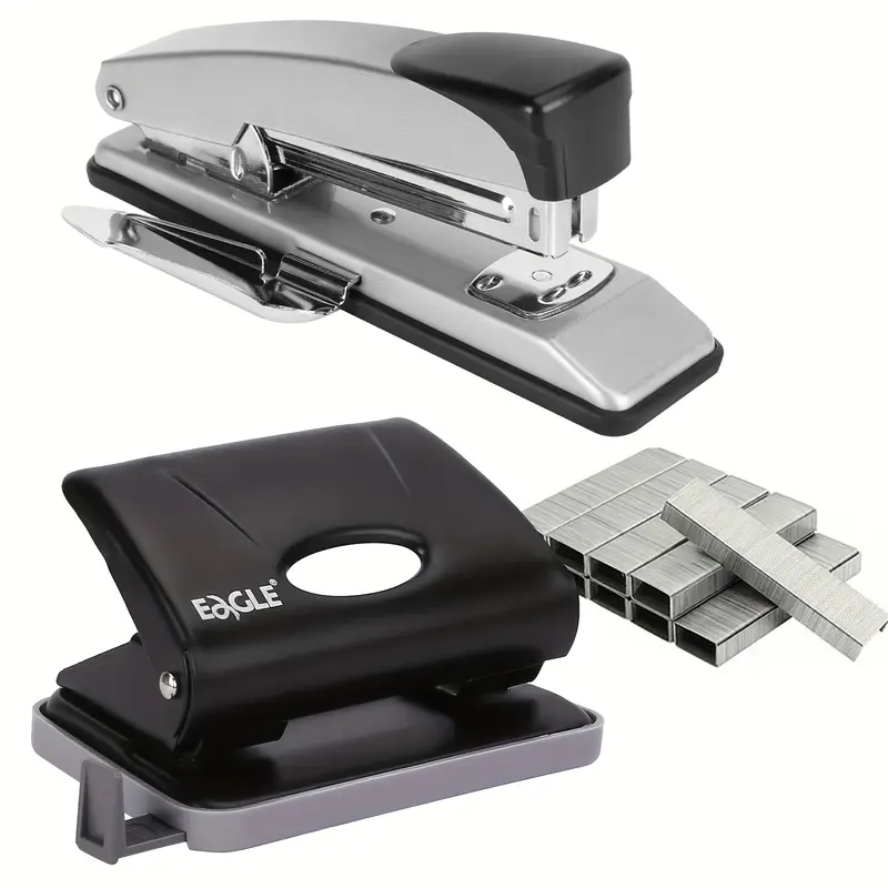 Punching Machines: Durable metal two-hole punch capable of punching up to 20 sheets of paper simultaneously. Features a sturdy locking mechanism and a removable chip tray for easy cleanup.